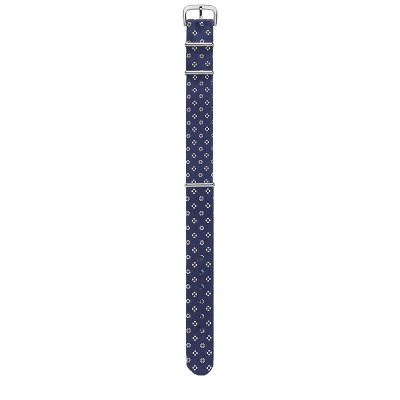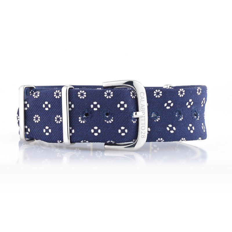 Cinturino Uomo appartenente alla collezione "Raimondo" di Calabritto28, realizzato in seta sartoriale con stampa cravatteria in alta definizione su fondo blu con micro fiori bianchi e fibbia in acciaio.