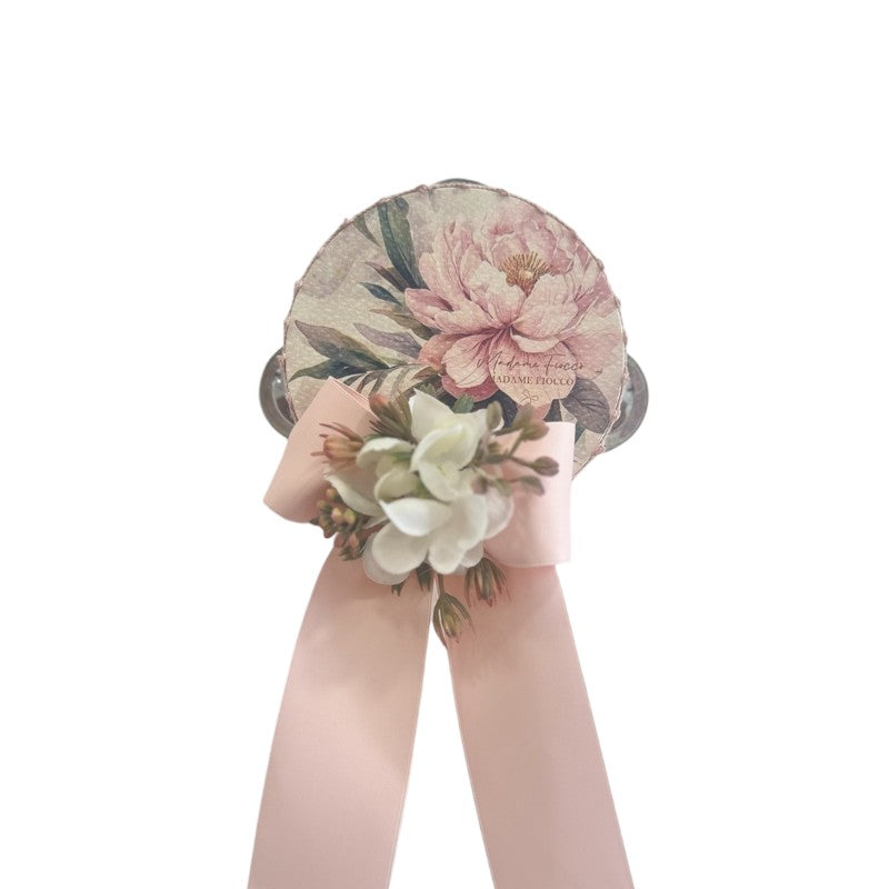 Tamburello Fior di Seta della collezione Madame Fioccò, impreziosito da decorazioni floreali e nastro di alta qualità.