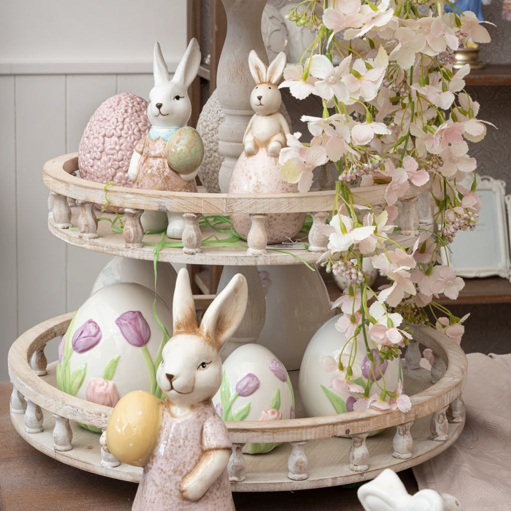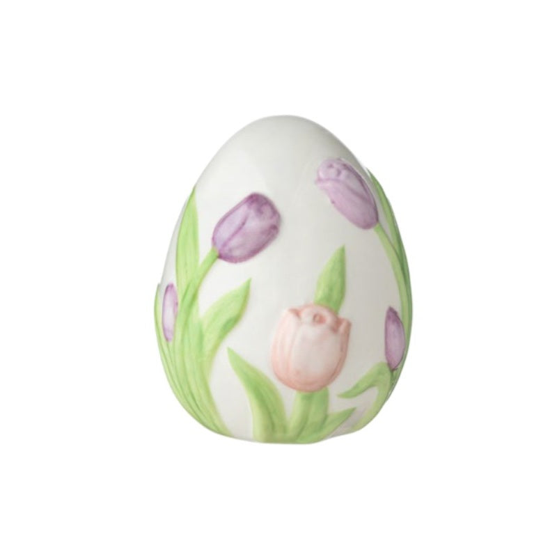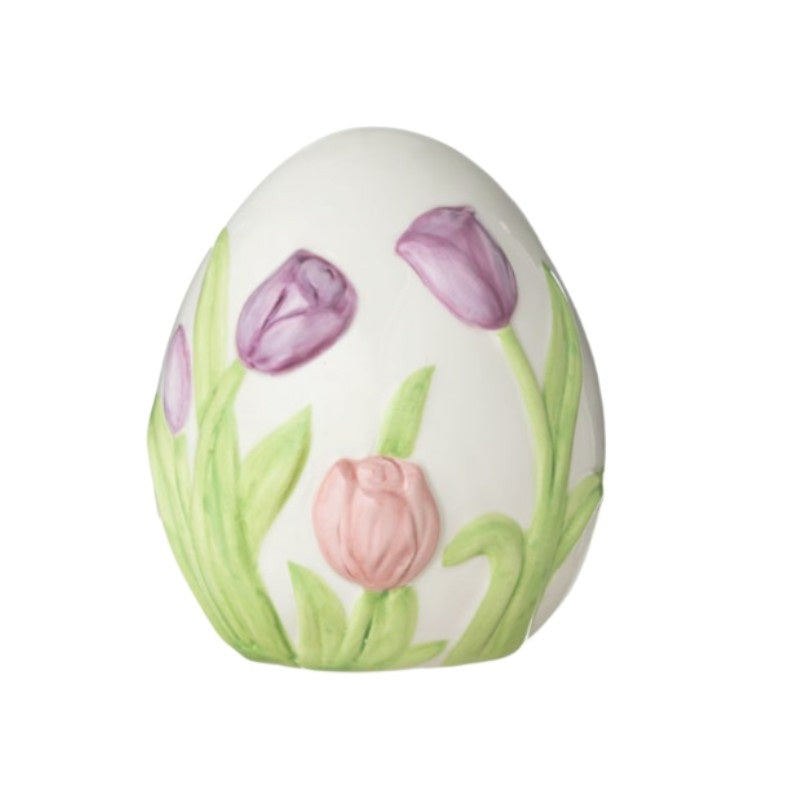 Uovo della collezione pasquale Prestigio Casa, realizzato in ceramica decorata con tulipani in rilievo.