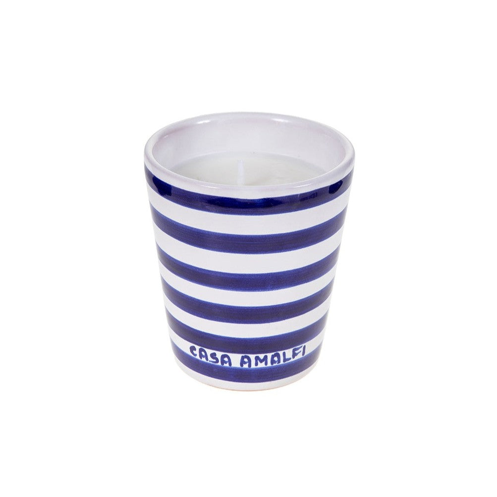 Candela di soia Blue Grotto della collezione Casa Amalfi, realizzata con cera di soia naturale e stoppino in cotone, vegan e cruelty free, con profumi marini e agrumati che evocano la bellezza del Mediterraneo e trasformano ogni ambiente in un rifugio di fascino costiero.
