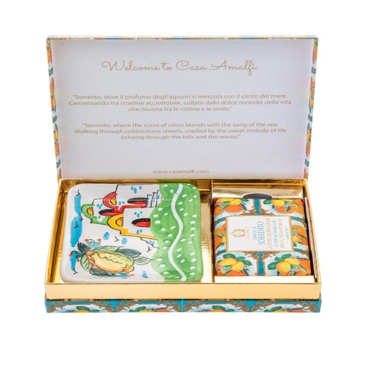 Gift Set Singolo Summer in Sorrento della collezione Casa Amalfi, con portasapone in ceramica dipinto a mano e un sapone di lusso 100% vegan e cruelty-free, nella profumazione Summer in Sorrento, con note di agrumi freschi e note di erbe aromatiche.