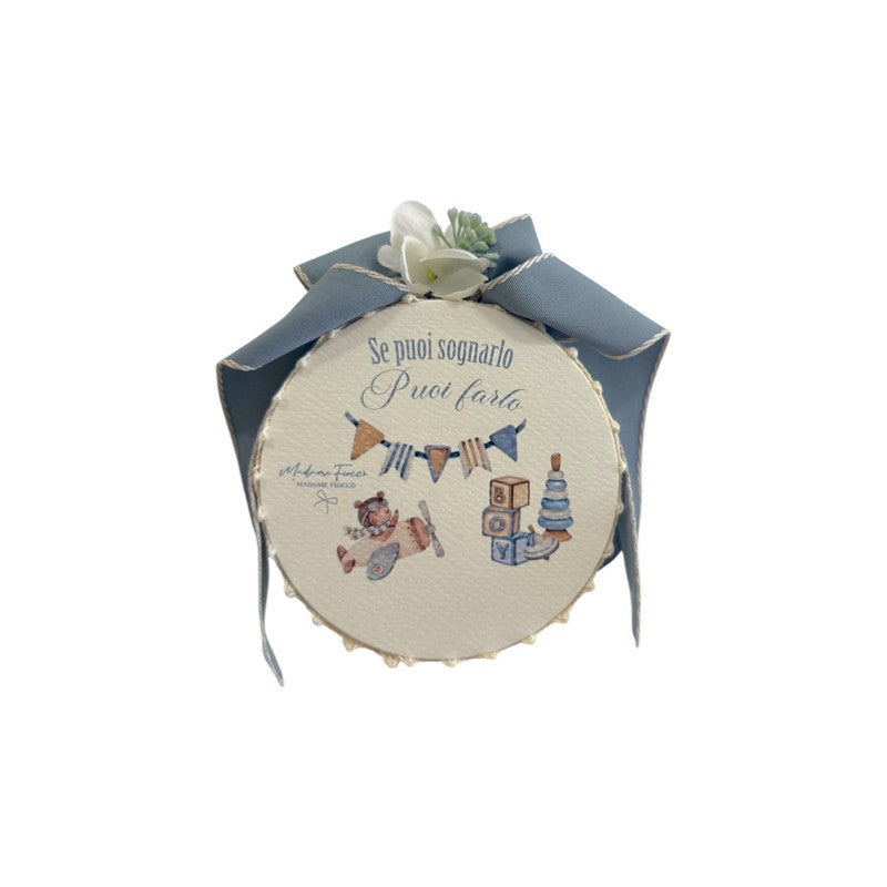 Tamburello della collezione New Born Collection di Madame Fioccò, realizzato con base in legno e stampa sulla superficie, impreziosito da un delicato fiocco azzurro e una raffinata decorazione floreale.