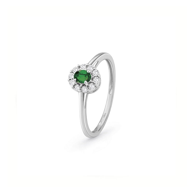Anello della collezione "Regal" di Bliss Gioielli, realizzato in Oro Bianco 18 Kt. con diamanti taglio brillante e smeraldo centrale taglio ovale.