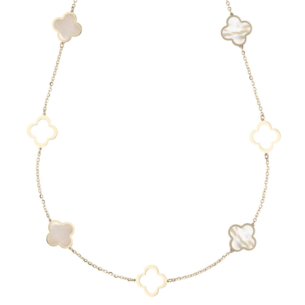 Collana con quadrifogli realizzata in Oro 18 kt. della collezione di Prestigio Gioielli, impreziosita da madreperla bianca.
