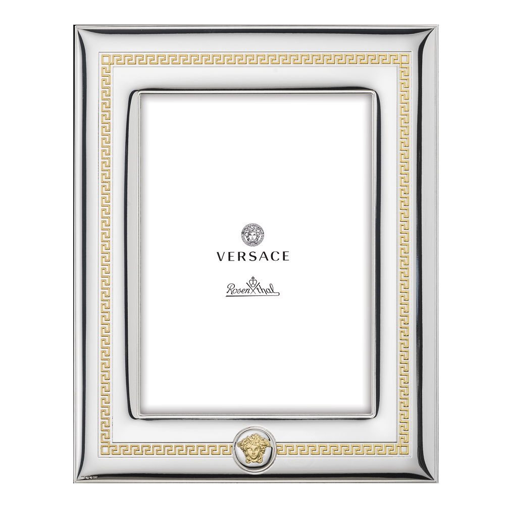 Cornice portafoto della collezione "Medusa" di Rosenthal Versace, realizzata in argento con greche color oro, su base dai toni dell'argento.