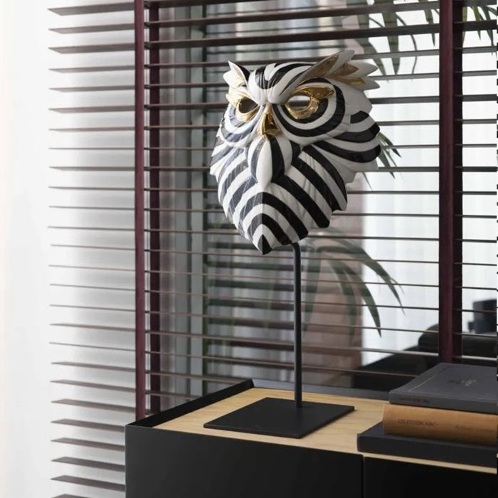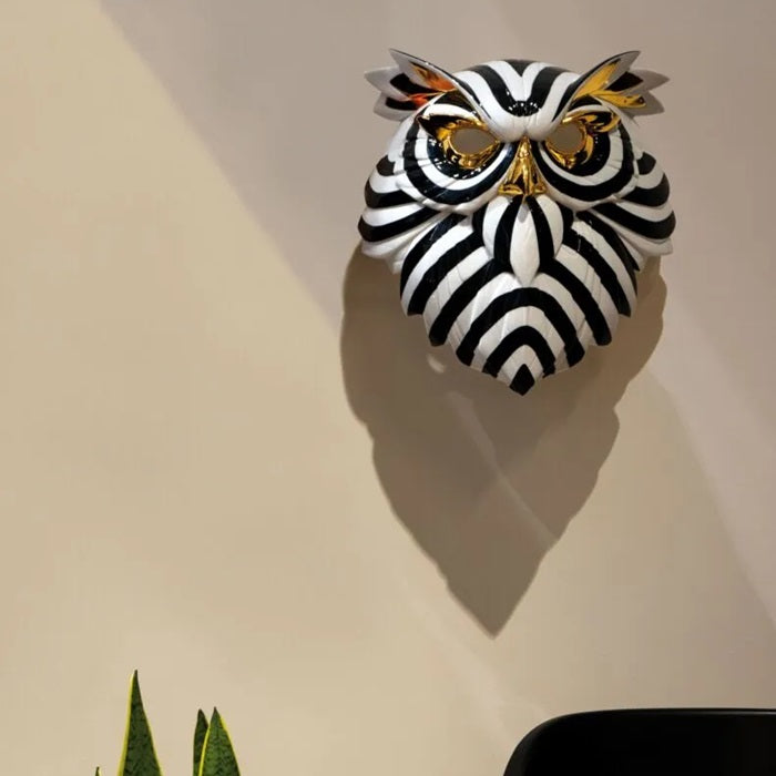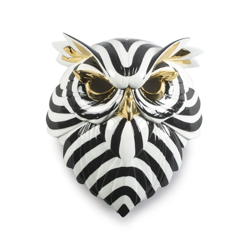 Maschera “Gufo” di Lladrò, realizzata in porcellana lucida decorata in nero e lustro oro, con elementi metallici in argento sterling placcato oro.