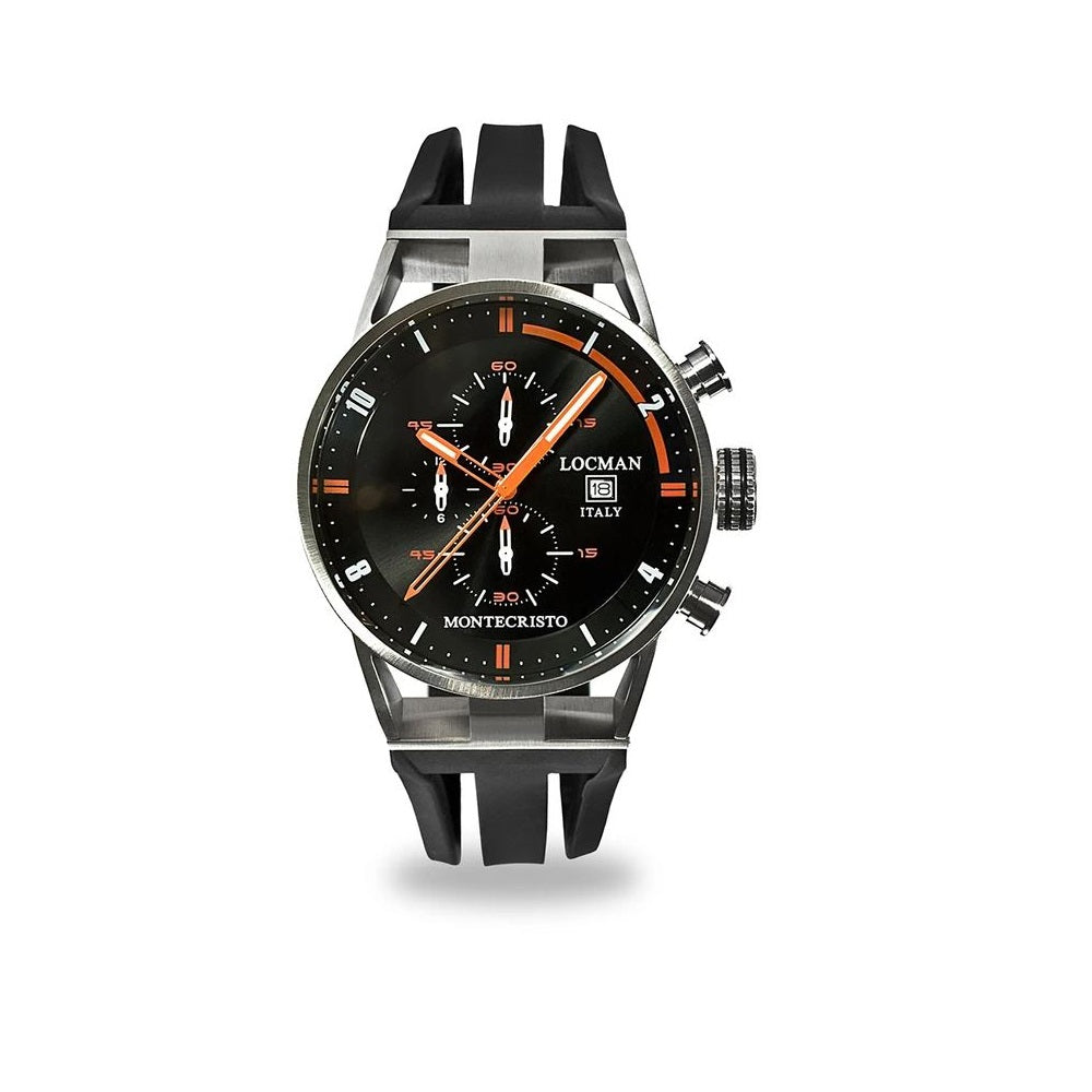 L’Orologio cronografo di Locman della collezione Montecristo , è realizzato da una cassa di diametro 44*13mm in acciaio in titanio e acciaio, offre un’idea di leggerezza grazie a un originale gioco alternato di vuoti e pieni, il quadrante è di color nero con finiture di colore arancio