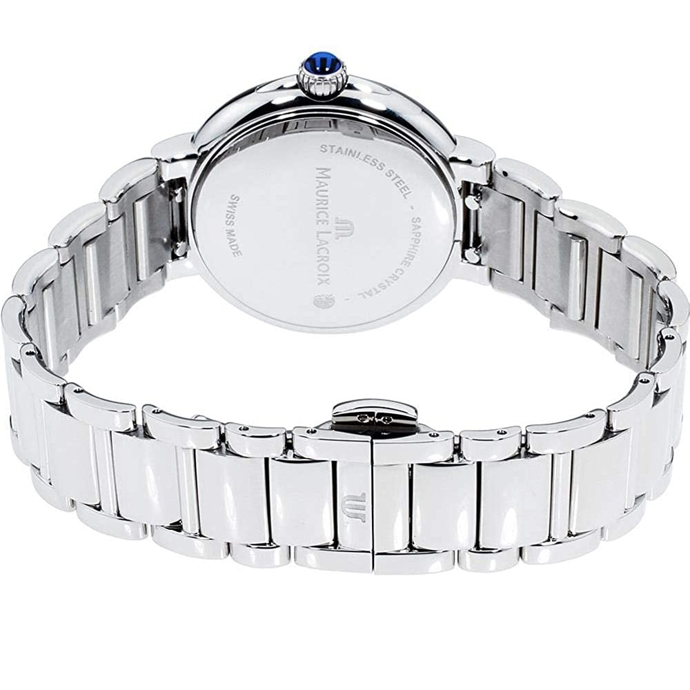 Rinomato per i suoi design di alta qualità e la sua innovazione, il marchio di orologi Maurice Lacroix è realizzato da una cassa con un diametro di 28mm,il quadrante in madreperla bianca con motivo guilloché "goccia d'acqua" con indici stampati in nero, lancette blu e datario a ore 3