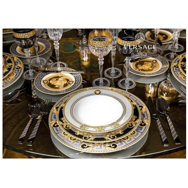La nuova prestigiosa collezione Prestige Gala con numerosi elementi in oro e platino dona un tocco di eleganza alla tavola con le tonalità del nero e del grigio e si lascia ispirare dal design iconico della seta di "Le Vase Baroque" di Versace.