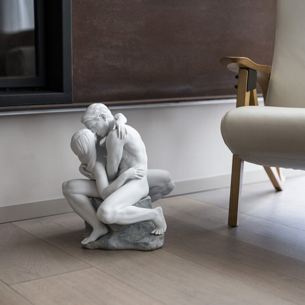 Scultura Coppia Bacio Appassionato appartentente alla collezione di Lladrò, realizzata in porcellana bianca satinata, raffigurante una coppia che si bacia su una roccia decorata con con i colori del blu e del verde.