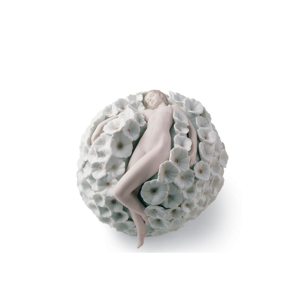 Scultura in porcellana opaca che raffigura una donna distesa su di una sfera ricoperta di fiori con morbidi tocchi di colore.