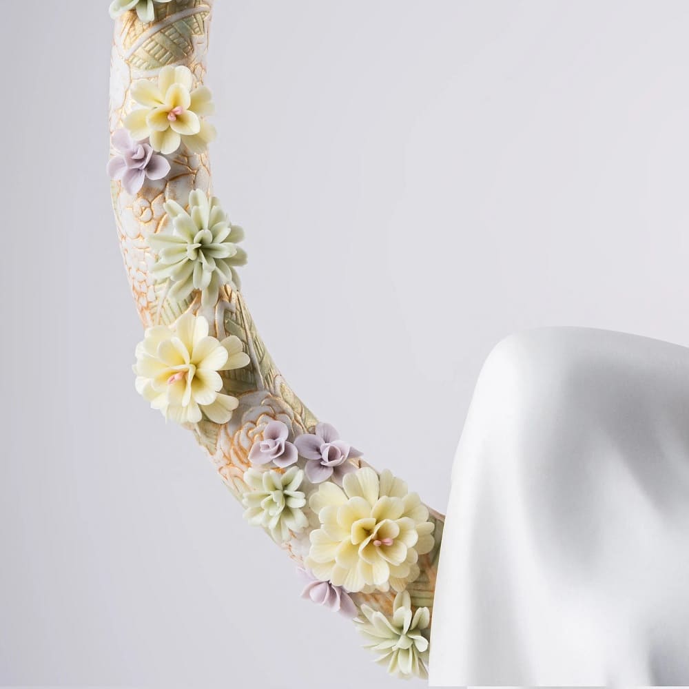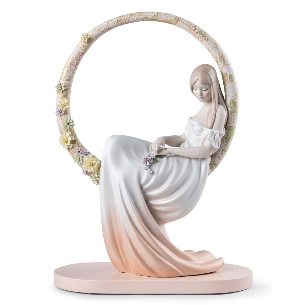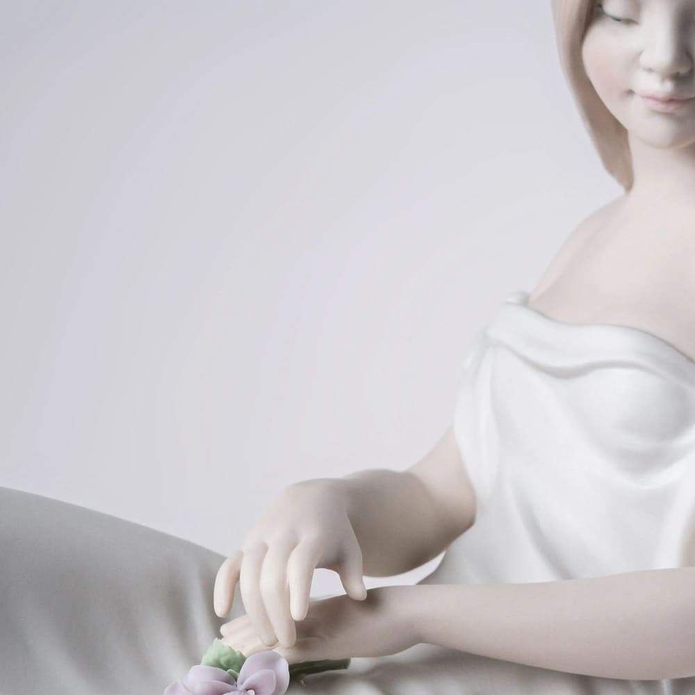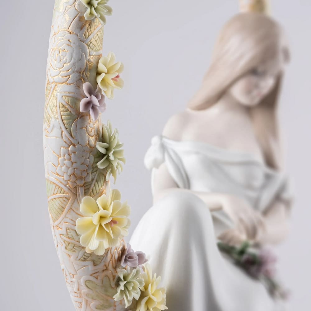 Scultura “Nei Suoi Pensieri” di Lladrò, realizzata in porcellana bianca opaca, decorata con colori tenui, fiori e effetti metallizzati.