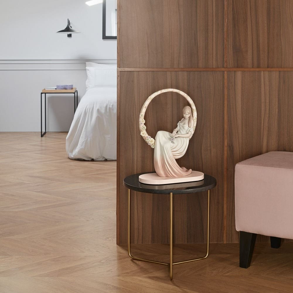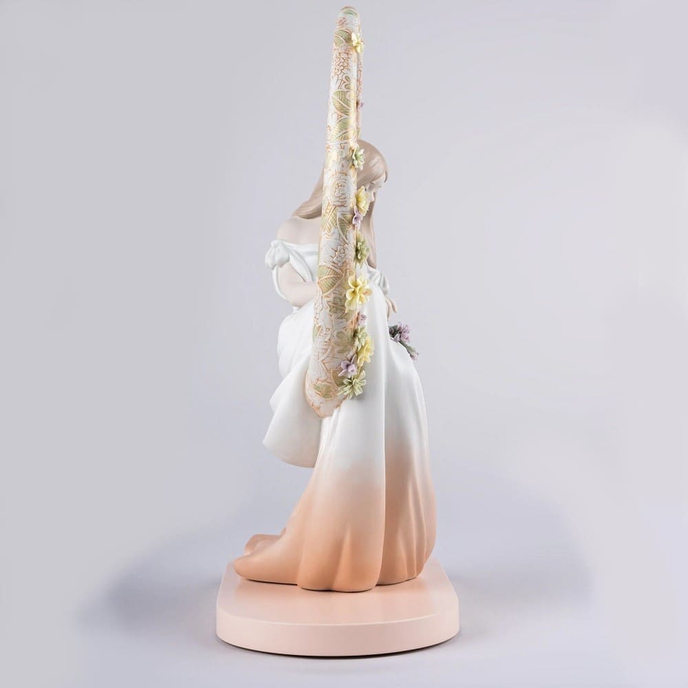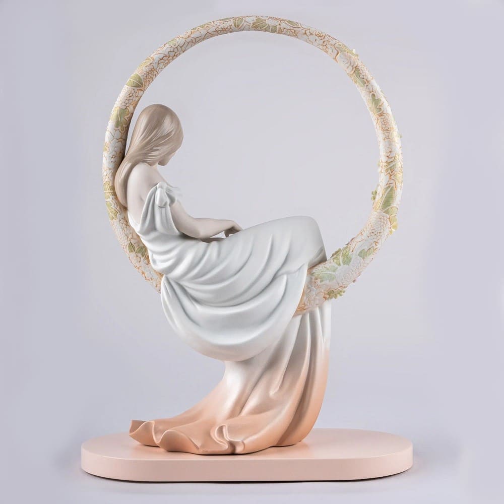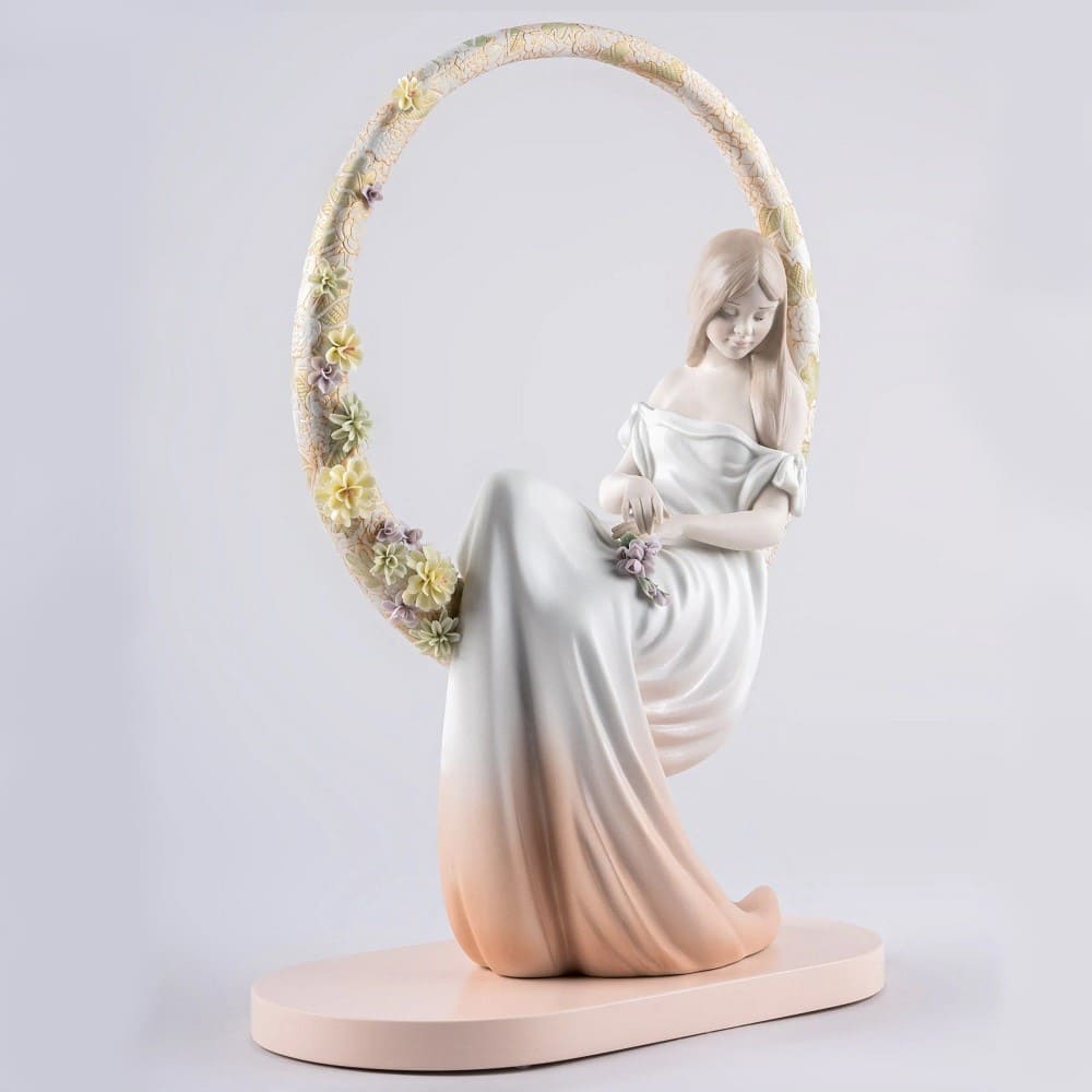 Scultura “Nei Suoi Pensieri” di Lladrò, realizzata in porcellana bianca opaca, decorata con colori tenui, fiori e effetti metallizzati.