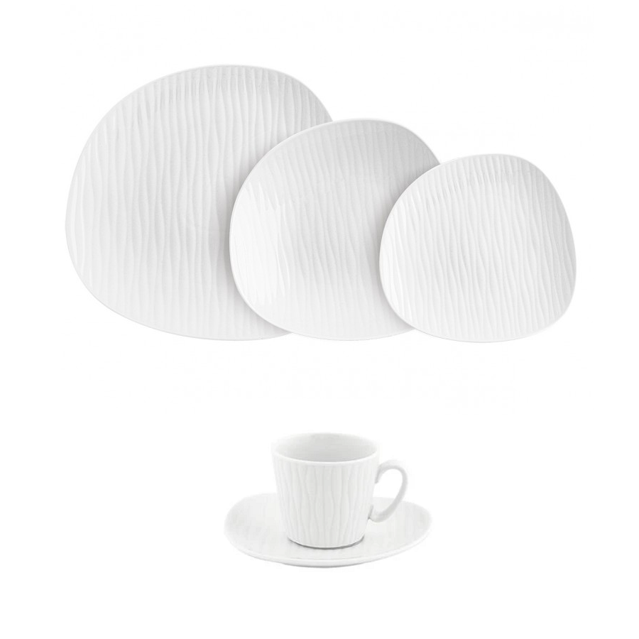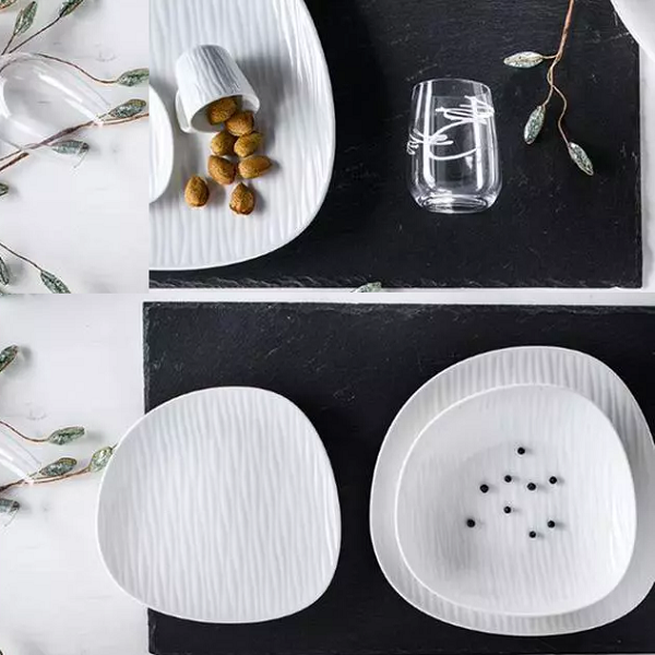 La mise en place Ylang con le sue forme irregolari e il suo stile total white, arricchito da un decoro a righe a rilievo, che la rende ancor più preziosa.