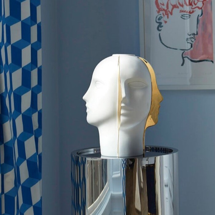 Il vaso Atlas Split presenta quattro doppi look: ogni volto perfettamente dimezzato rivela un profilo in porcellana opaca da un angolo e una scintillante silhouette dorata dall'altro.