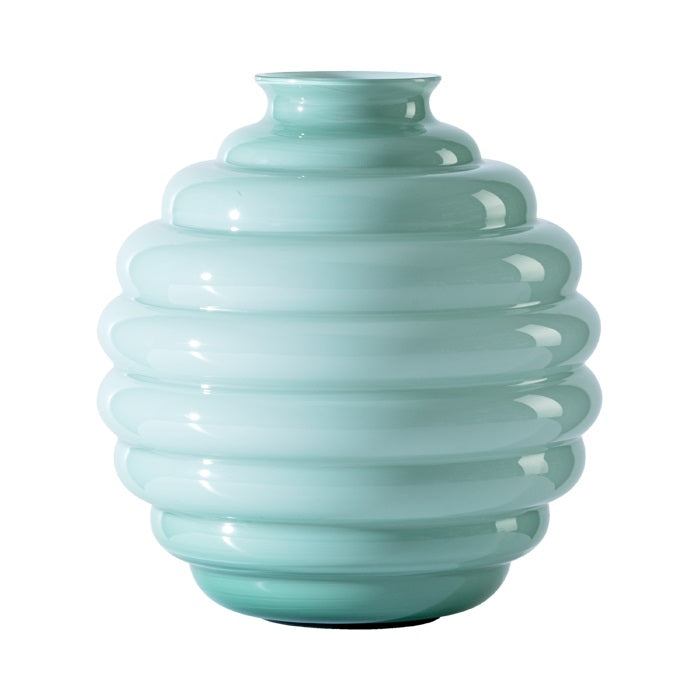 Vaso Deco di Venini, realizzato in vetro soffiato verde rio, ottenuto dalla sovrapposizione del lattimo con altri vetri.
