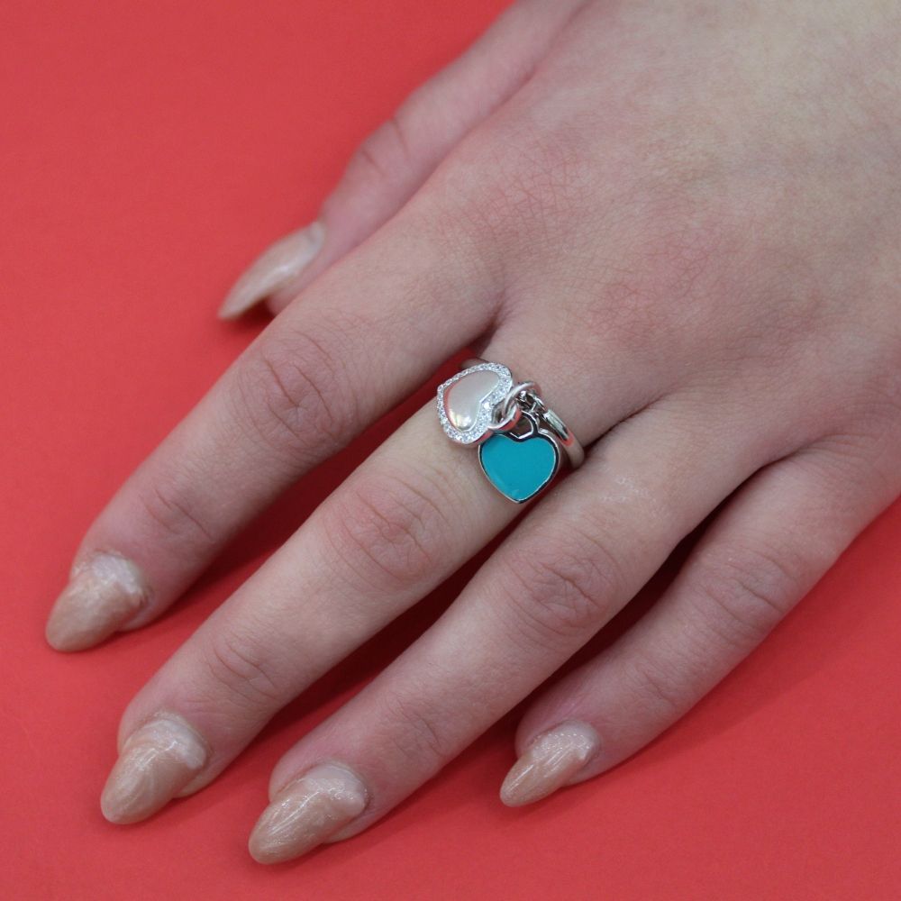 Anello Regolabile Tiffany della Collezione Prestigio Gioielli, realizzato in Argento 925% rodiato con due cuori pendenti uno di colore verde tiffany smaltato e l'altro impreziosito da Swarovski.