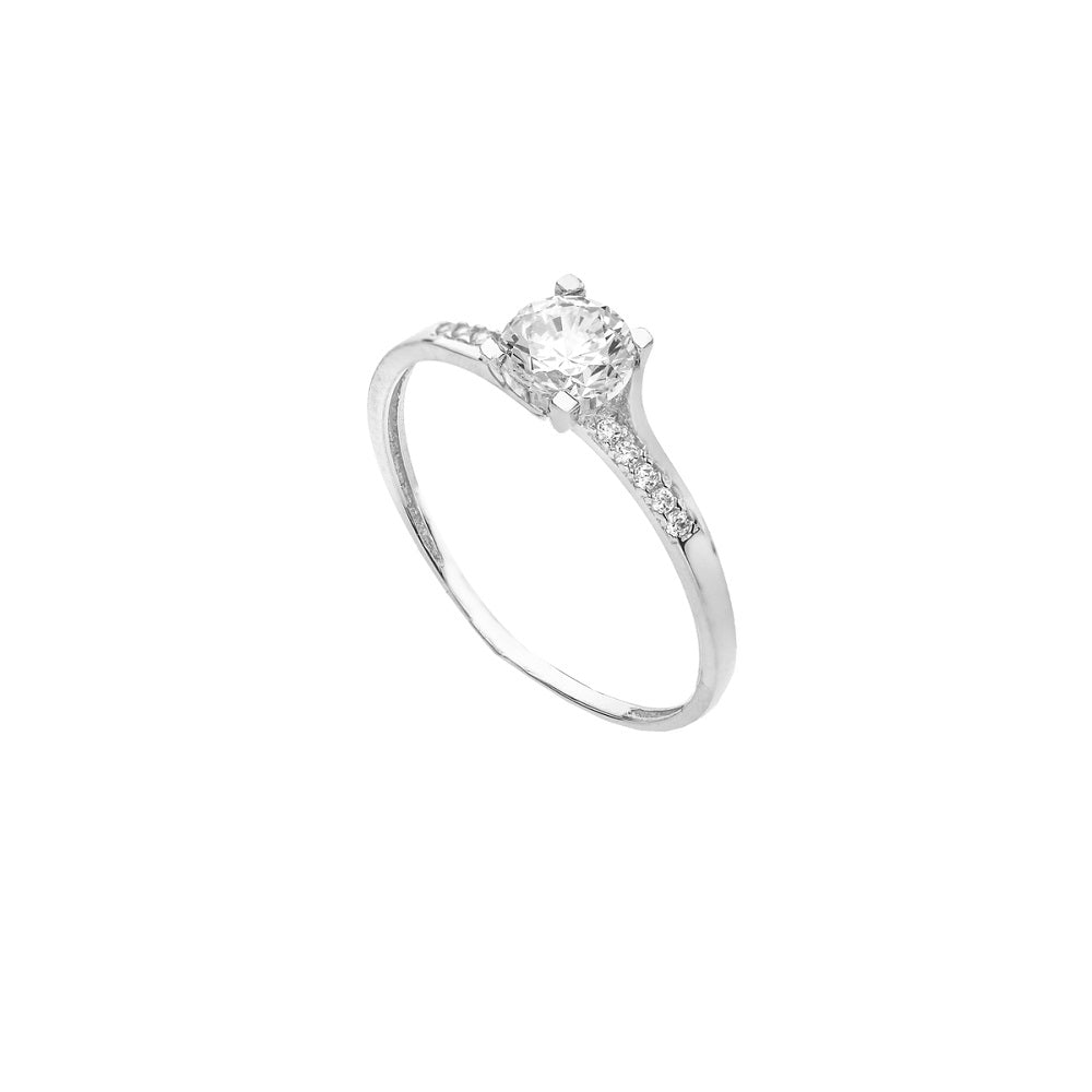 Anello realizzato in Oro Bianco 18kt della Collezione Prestigio Gioielli, caratterizzato da una finitura lucida, da uno zircone centrale taglio brillante e da zirconi laterali.