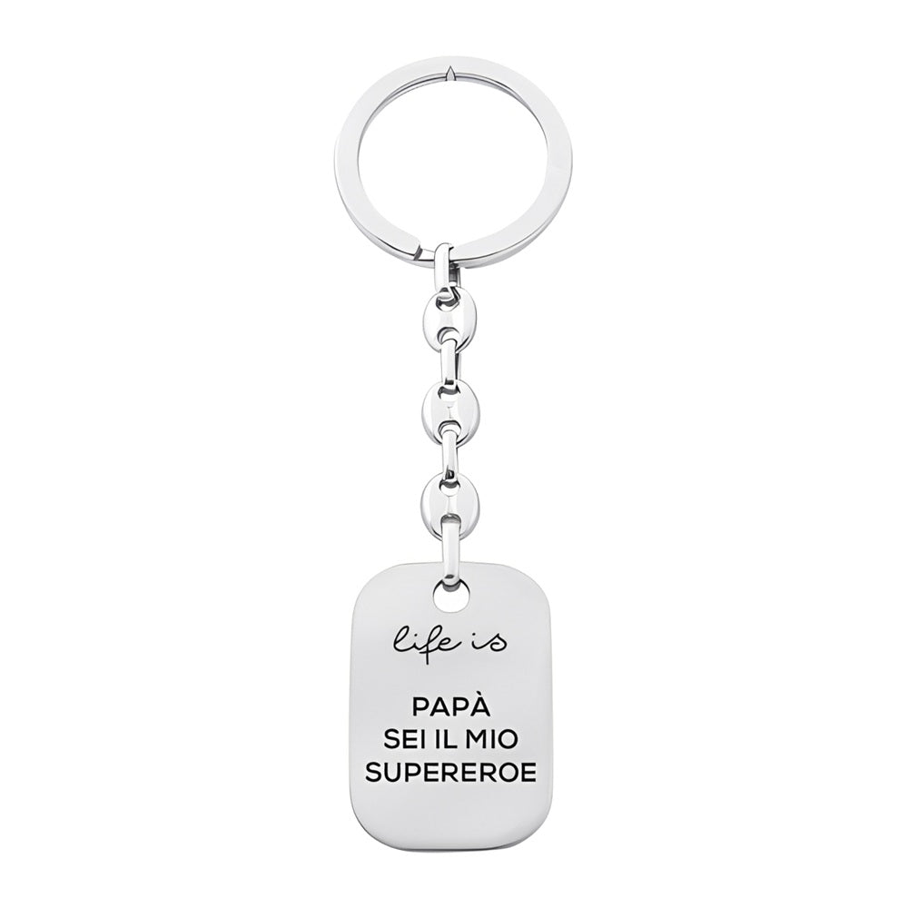 Portachiavi della collezione Prestigio Gioielli, realizzato in acciaio inossidabile, con incisione smaltata "PAPA' SEI IL MIO SUPEREROE".