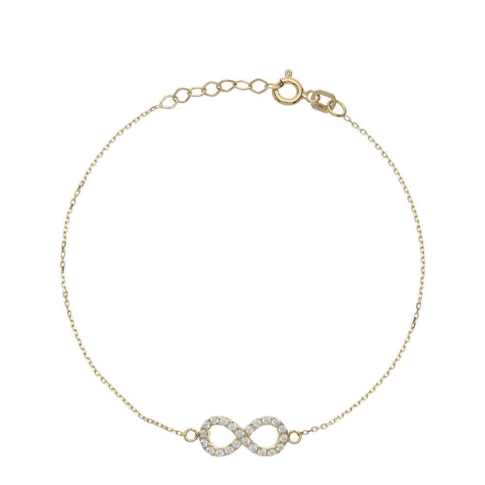 Bracciale realizzato in Oro Giallo 18kt della Collezione Prestigio Gioielli, caratterizzato da un centrale a forma di infinito, impreziosito da pavè di zirconi con finitura lucida.