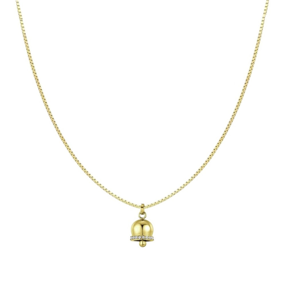 Collana della collezione Prestigio Gioielli, realizzata in argento 925% rodiata in Oro Giallo 18 kt., con campanella pendente, impreziosita da zirconi bianchi.