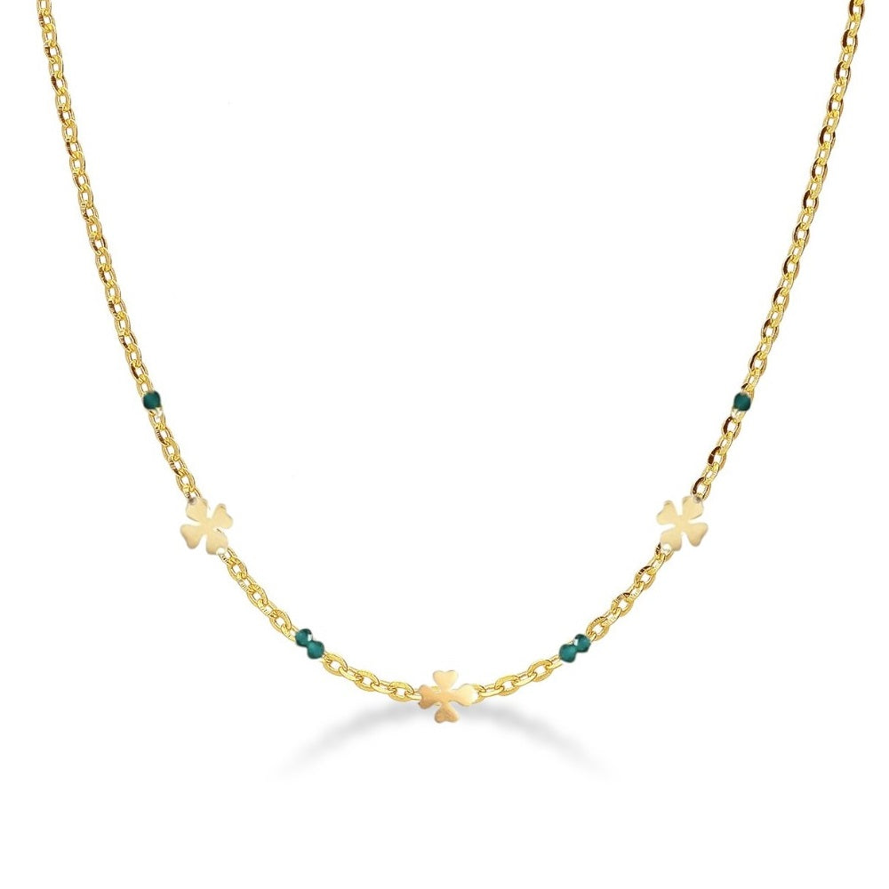 Collana della collezione “Lucky Charms” di Prestigio Gioielli, realizzata in argento 925% rodiata in Oro Giallo 18 kt., impreziosita da quadrifogli e pietre verdi.