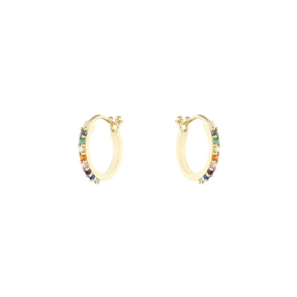 Orecchini a cerchio da donna della Collezione Prestigio Gioielli, realizzati in Oro Giallo 18kt., impreziositi da zirconi rainbow in microfusione.