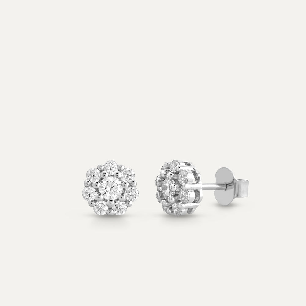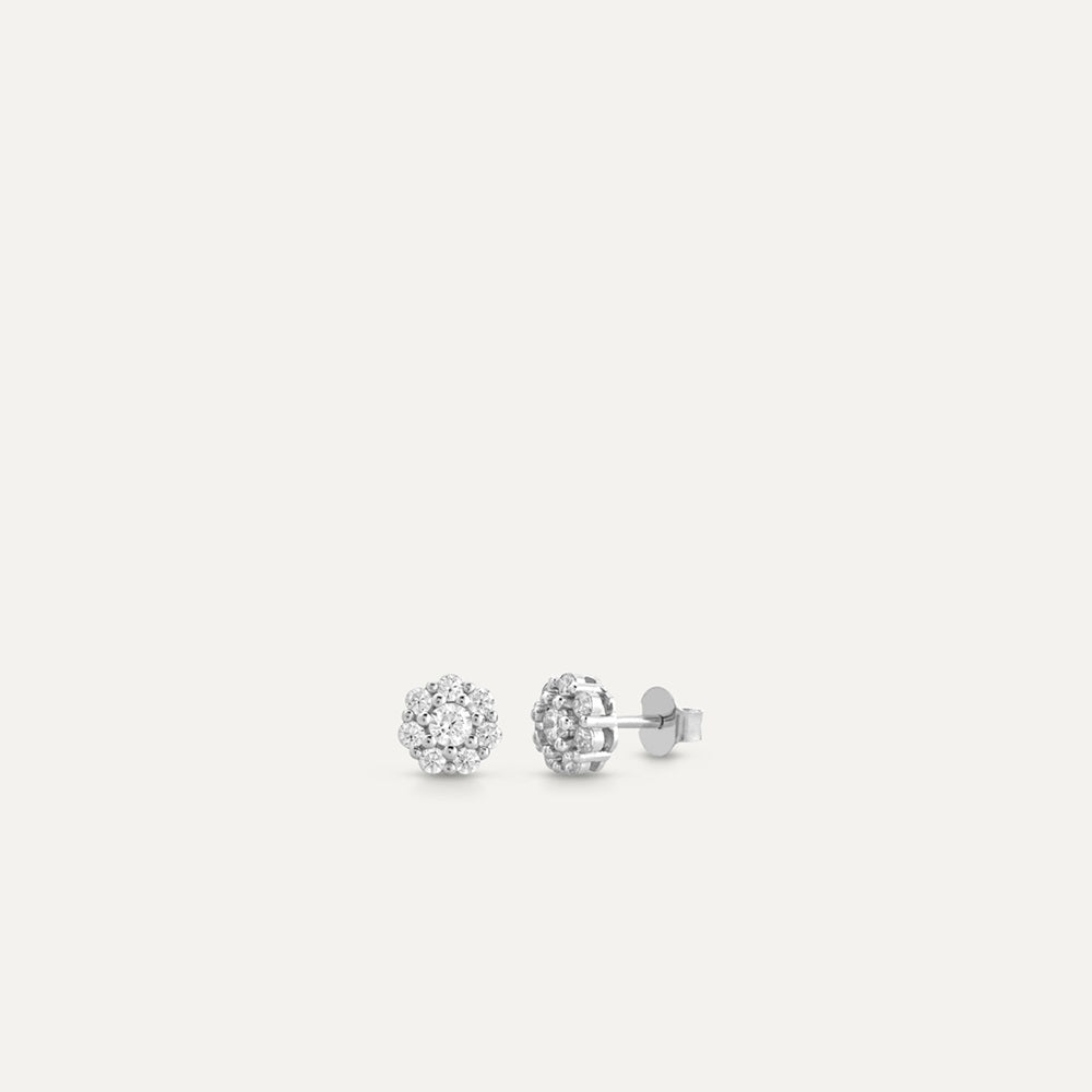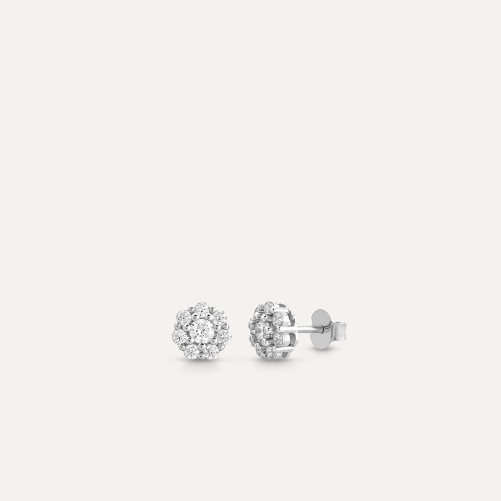 Orecchini Mini Flower realizzati in Argento 925% rodiati in Oro Bianco 18 kt., impreziositi da zirconi bianchi.