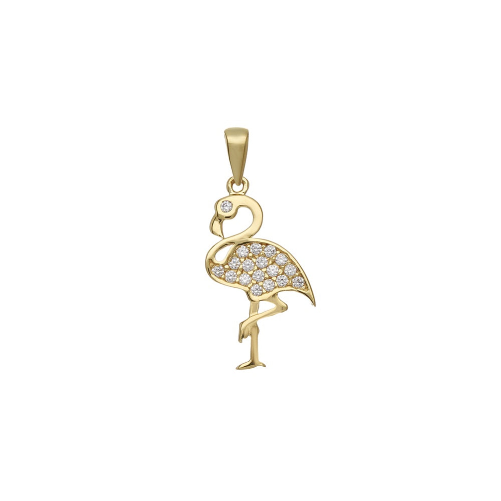 Ciondolo a forma di Fenicottero realizzato in Oro Giallo 18kt. della Collezione Prestigio Gioielli, impreziosito da zirconi bianchi in microfuzione con finitura lucida.