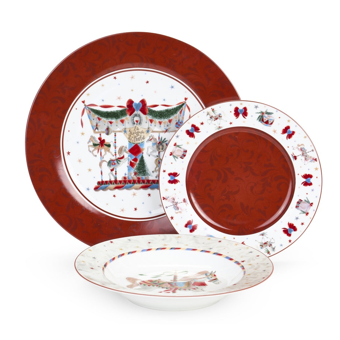 Set Piatti da 36 pezzi per 12 persone della collezione "La Giostra di Amelie" di Nuvole di Stoffa, realizzato in porcellana lucida decorata.