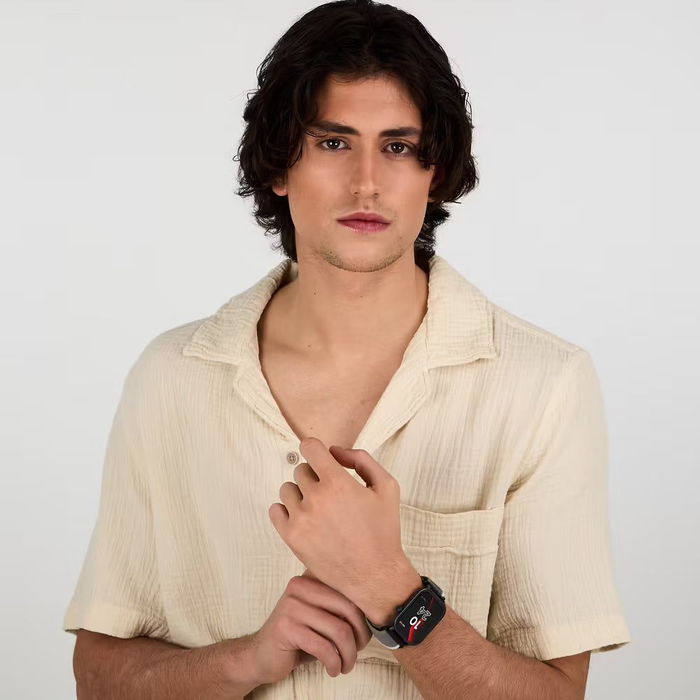 Il cinturino in tessuto grigio, resistente e confortevole, assicura una perfetta vestibilità anche durante l’allenamento, mentre la chiusura Stud garantisce stabilità e praticità.