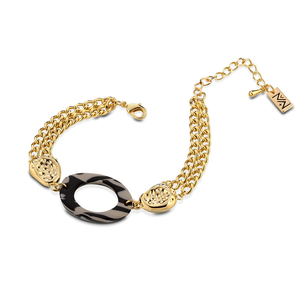 Questo gioiello presenta un elemento ovale effetto zebrato intercambiato da oggetti dorati.
