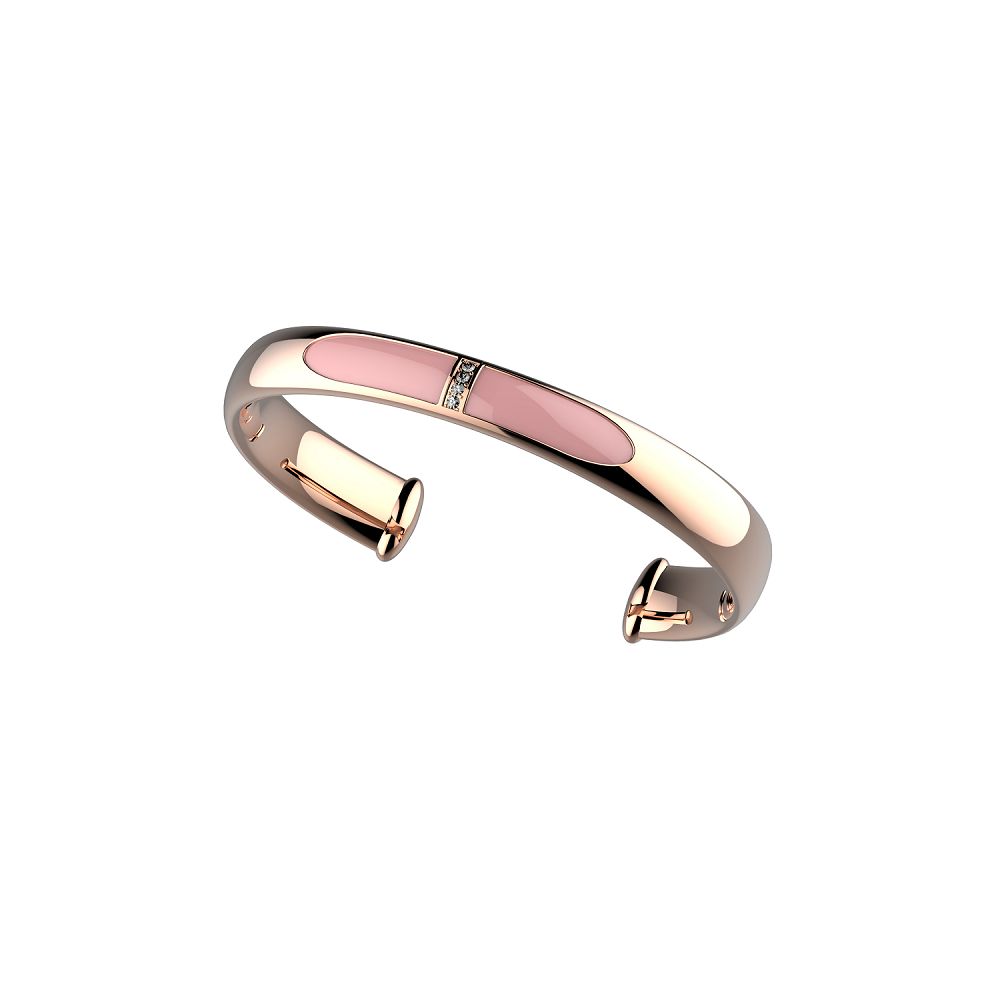 Il gioiello è di colore oro rosacon finitura smaltata di colorerosa impreziosito da swarovki.
