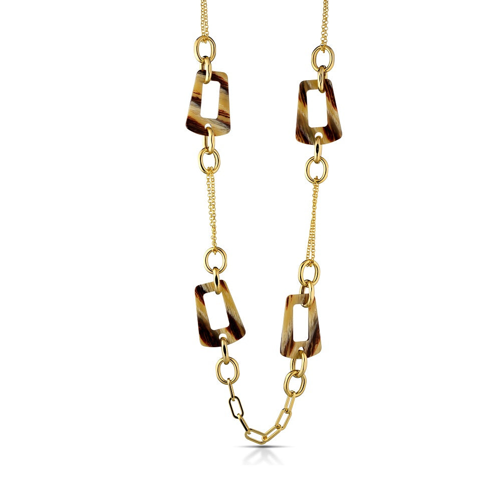 Realizzata in acciaio anallergico, la collana è caratterizzata da elementi squadrati intercambiati da anelli con finitura dorata lucida.