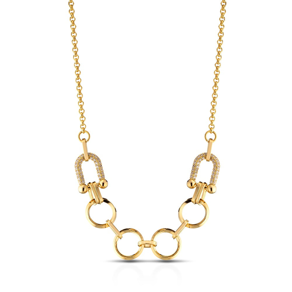 Collana da donna della collezione "Helsinky" di MEWO GIOIELLI, realizzata in ottone anallergico con finitura dorata, caratterizzata da elementi dorati centrali impreziositi da zirconi bianchi.