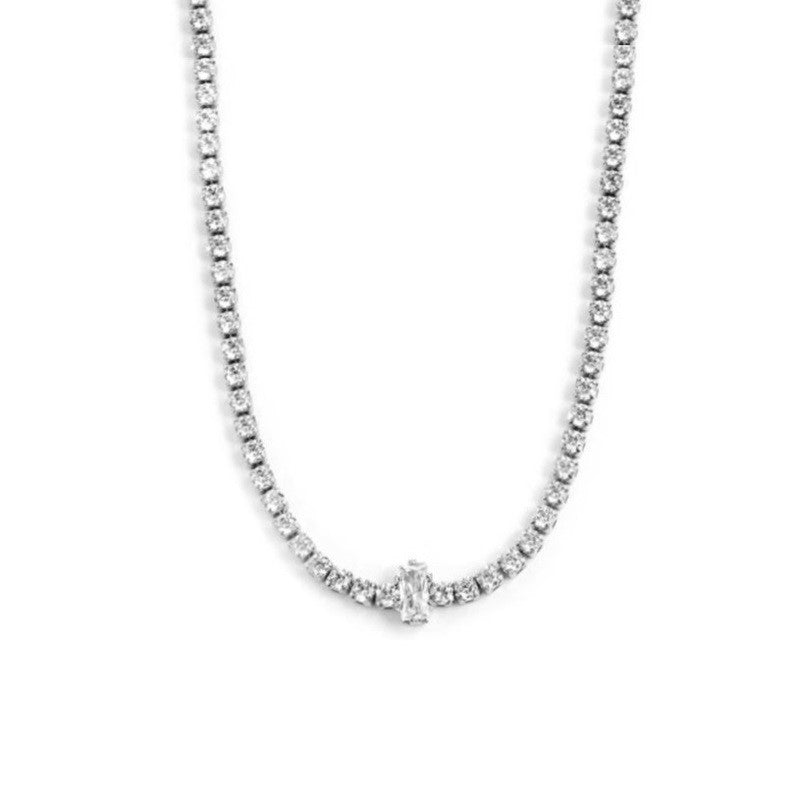 Collana tennis della collezione Marlù, realizzata in acciaio inossidabile, impreziosita da cristalli bianchi con centrale taglio baguette.