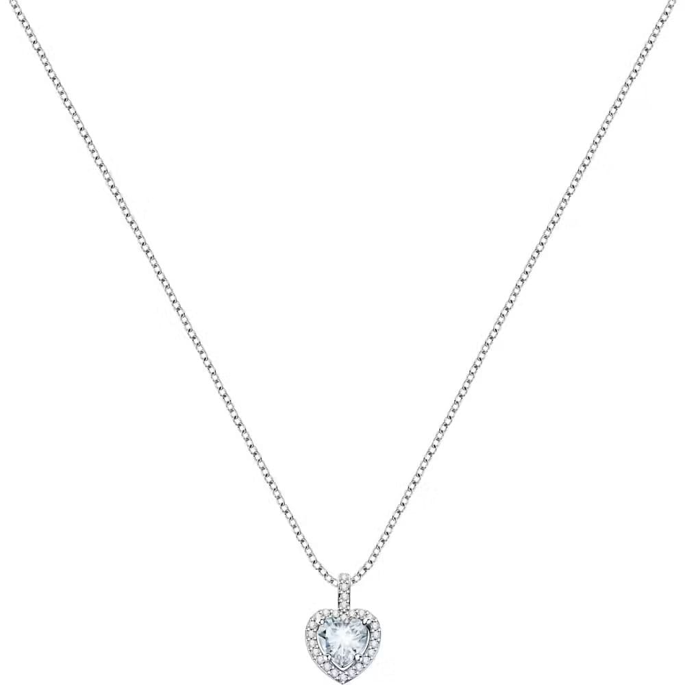 Collana donna della collezione Tesori di Morellato, realizzata in argento 925%, con pendente a forma di cuore con cristallo bianco centrale contornato da zirconi.