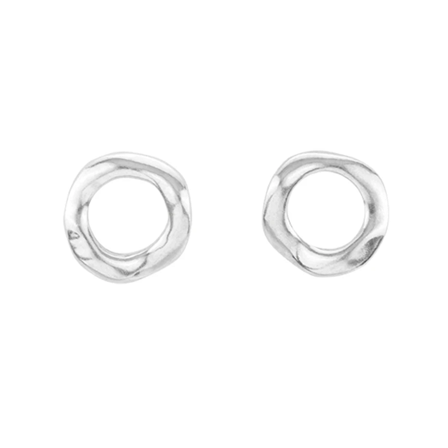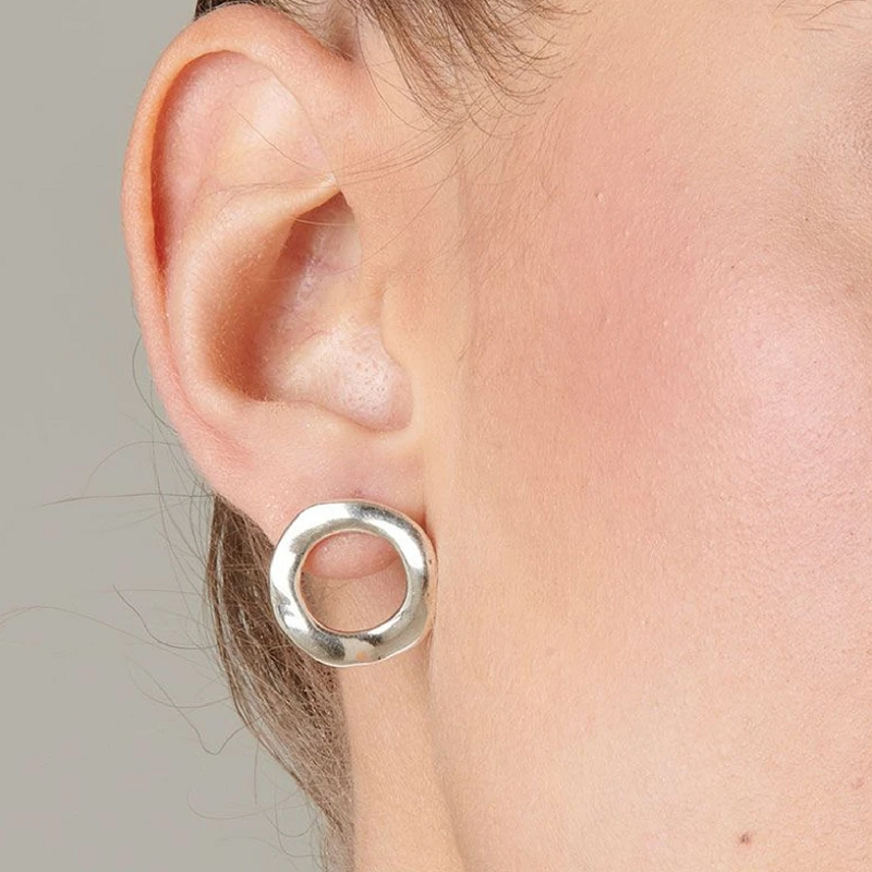 Orecchini della linea UNOde50, realizzati in lega metallica rivestita in argento, a forma di cerchio, con contorni irregolari e chiusura è a perno.