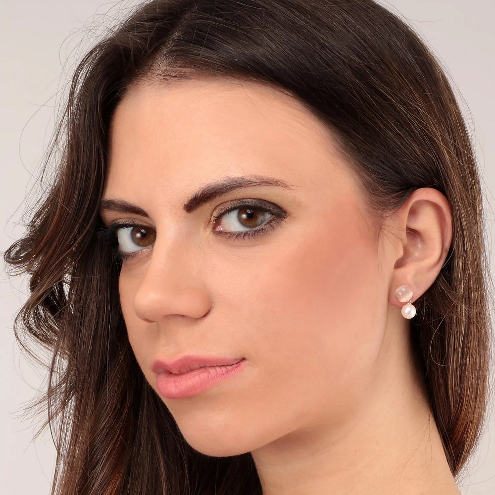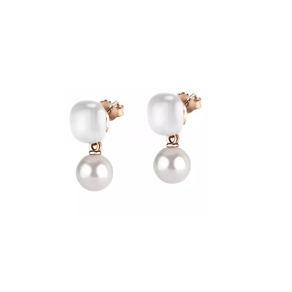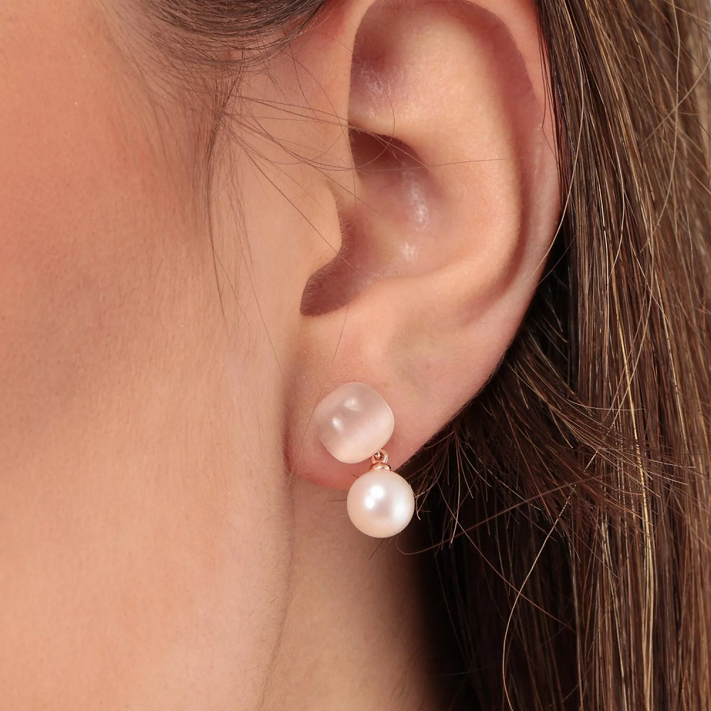 Orecchini appartenenti alla collezione Gemma Perla di Morellato modello a lobo con pietra Cat Eye e piccola perla pendente. Realizzati interamente in Argento 925 rosato.