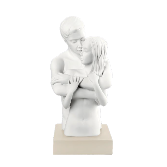 Scultura realizzata in marmorino. Raffigura l'abbraccio intenso di una giovane coppia di innamorati su base di color beige.