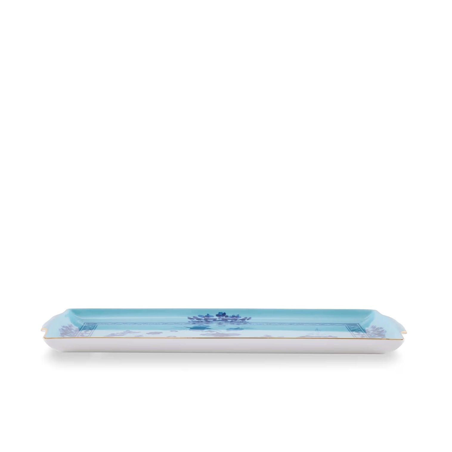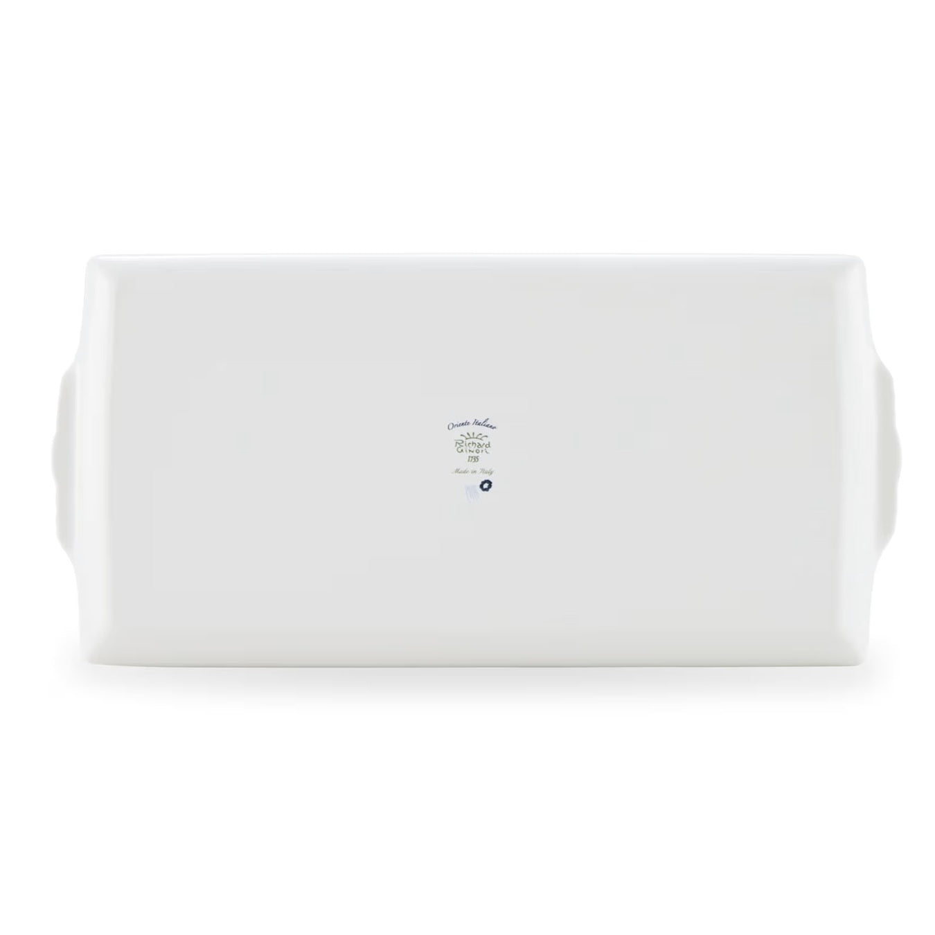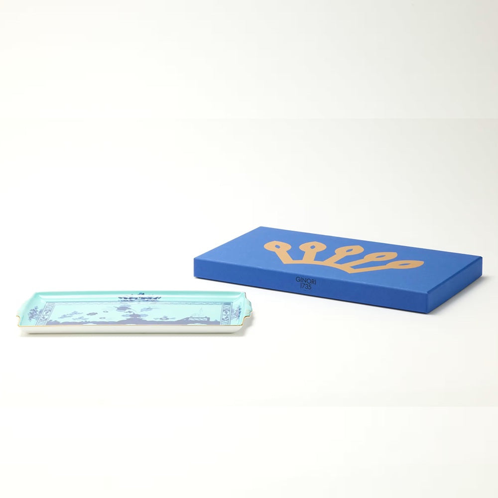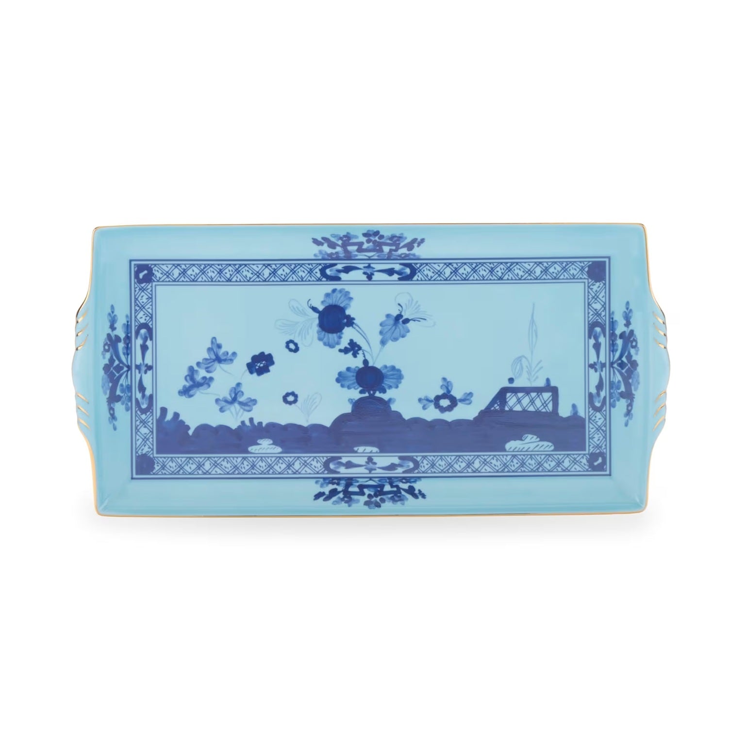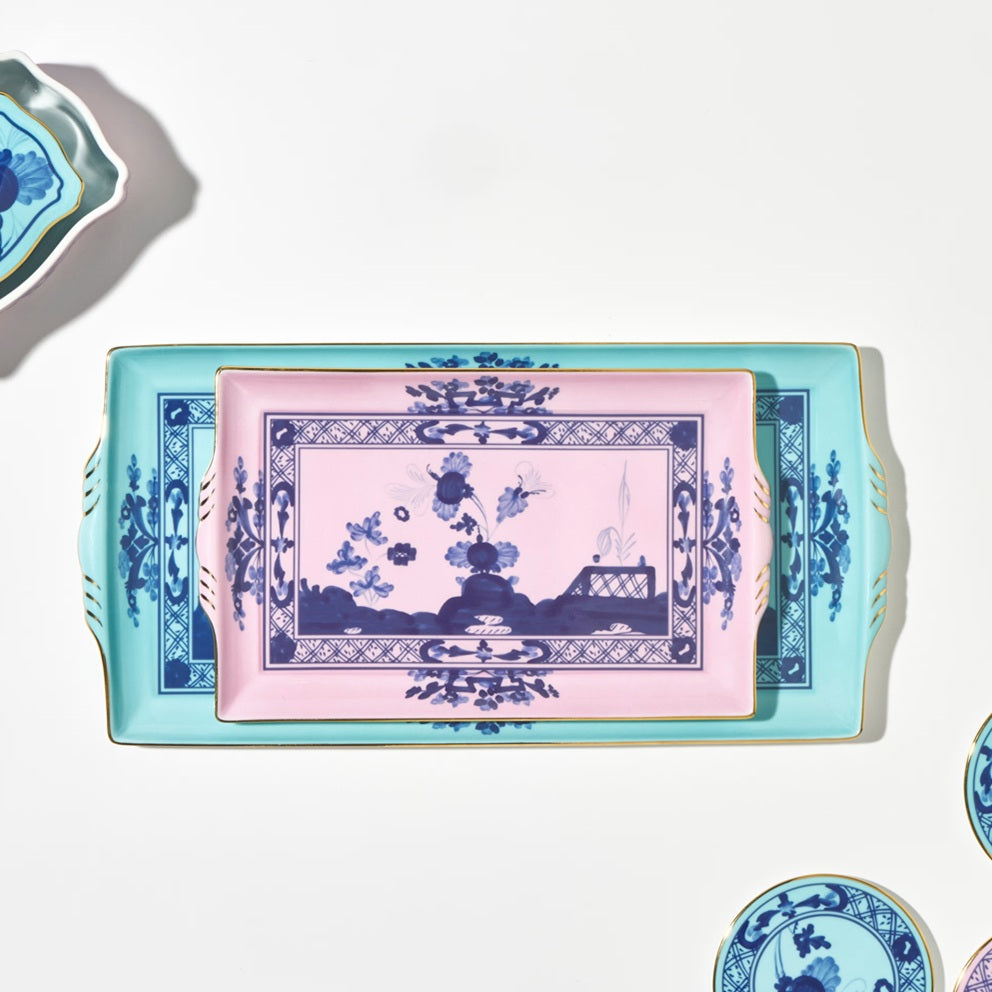 Vassoio rettangolare con manici della collezione Oriente Italiano Iris di Richard Ginori, realizzato in porcellana lucida decorata.