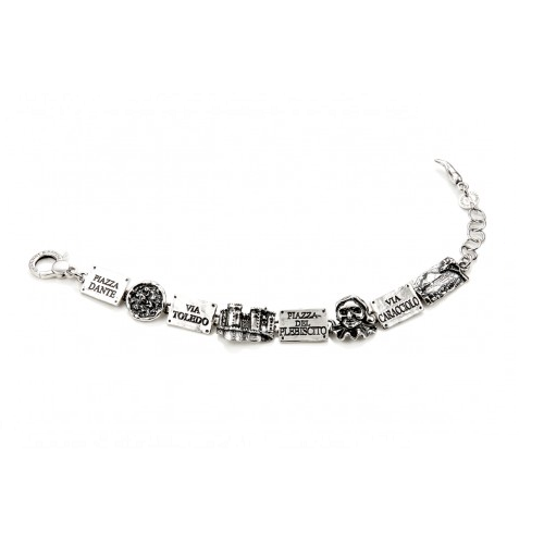 Bracciale della collezione "Napoli" di Giovanni Raspini, realizzato in Argento 925% brunito, con charms raffiguranti simboli e luoghi dedicati alla straordinaria città di Napoli.