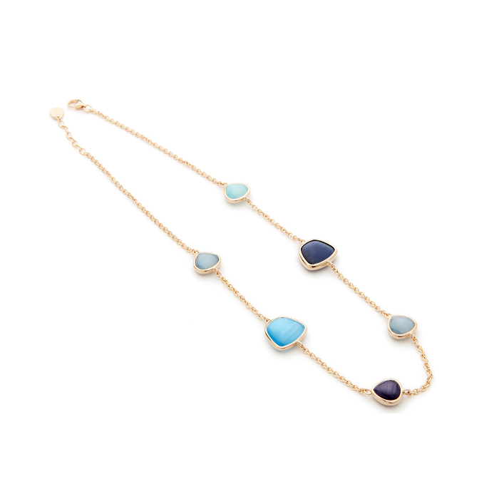 Collana della collezione "Nuvole" di Madì , realizzata in argento 925% rodiato in oro rosa 18kt, caratterizzata da elementi in quarzo idrotermale dalle nuances del blu e dell'azzurro.