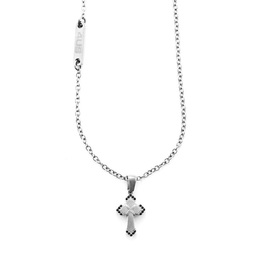 Collana da uomo della collezione 4US Cesare Paciotti, realizzata in acciaio anallergico rodiato, con croce pendente impreziosita da zirconi neri.