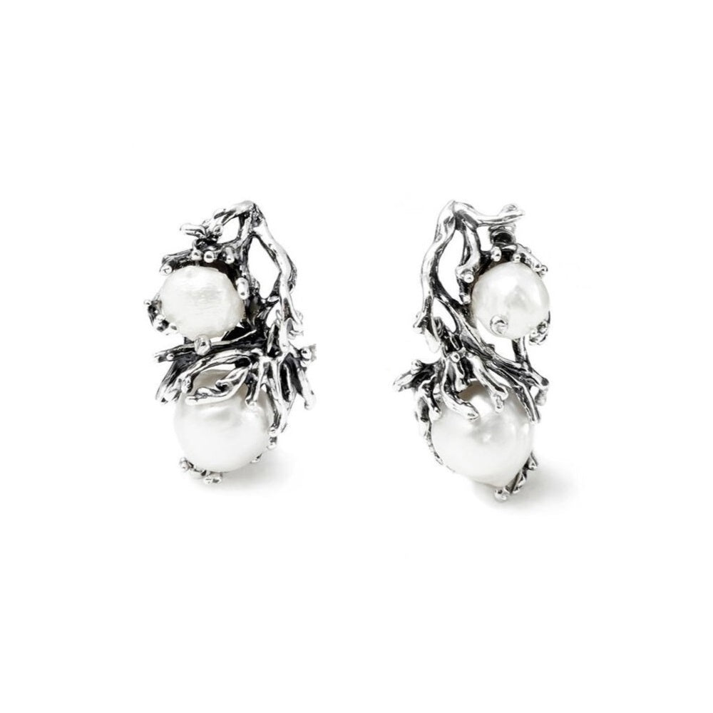 Orecchini della collezione "Mari del Sud"di Giovanni Raspini, realizzati in argento brunito, impreziositi da perle naturali.