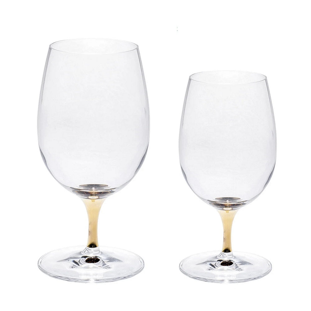 Set 12 Bicchieri composto da 6 Calici Vino + 6 Calici Acqua, appartenenti alla collezione “Sandalo Oro” di Villa Altachiara, realizzati in vetro resistente con supporto dorato.