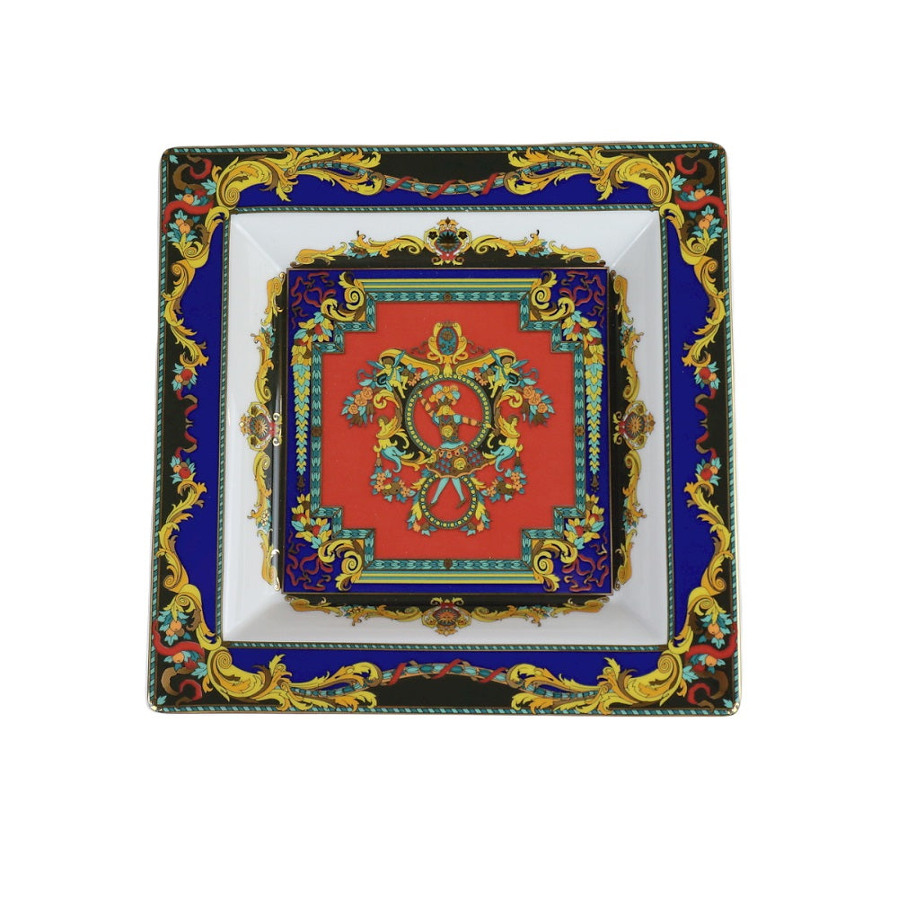 Svuotatasche fa parte della collezione di Rosenthal è carraterizzato da un esplosione di colori tra cui predomina il blu ed il rosso lucente Per questo tipo di decorazione i colori vengono fatti fondere nel vetro a più di 1000°C. In questo modo il vetro si ammorbidisce e la decorazione viene assorbita al suo interno, così che sia il colore che la luminosità risultino estremamente resistenti a graffi